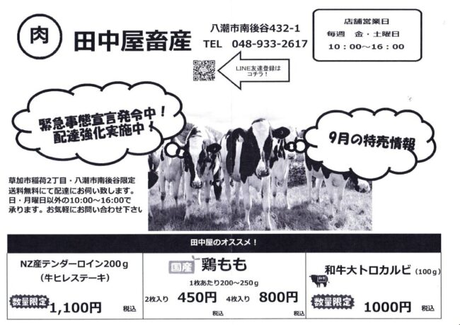 ホームページリニューアル致しました インフォメーション, 田中屋畜産チラシ, 美味しい調理方法&肉の豆知識By sasakihpm2021年10月31日ホームページリニューアル致しました。 今後とも宜しくお願い致します。 〒340-0831 埼玉県八潮市南後谷432-1 TEL 048-933-2617 FAX 048-933-2616